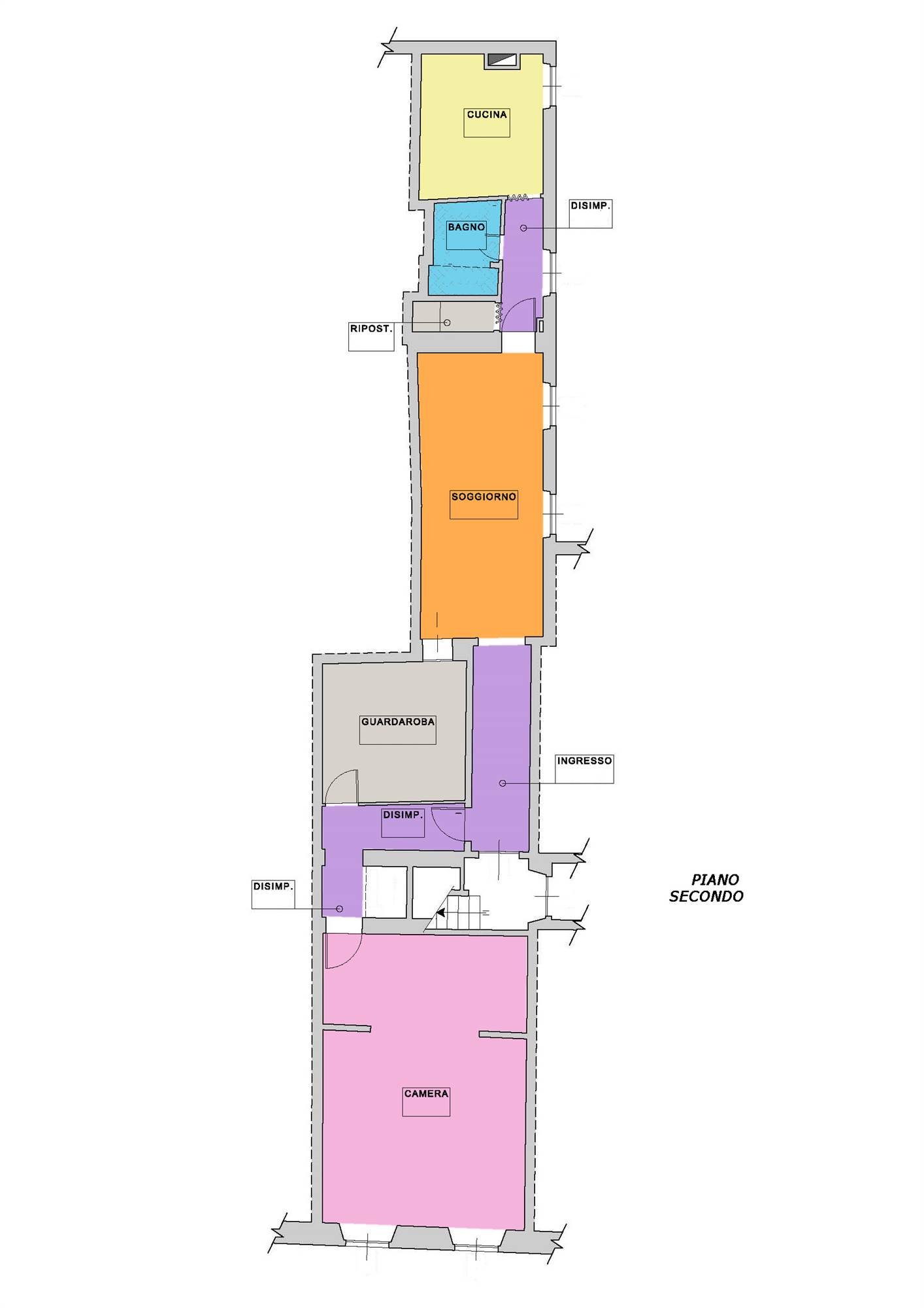 Internamento è composto da ampio ingresso - corridoio che introduce nel luminoso soggiorno con doppia finestra, il disimpegno ci accompagna nella cucina abitabile con camino, bagno con doccia, ripostiglio, camera matrimoniale di circa 36 mq. dove è possibile ricavare due stanze, vano ad uso camera.